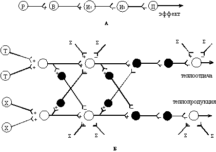 Как показано на схеме, растормаживающие и возбуждающие пути, начинаясь из разных поверхностных и глубоких тканей, могут действовать на пейсмекеры отдельно друг от друга. В настоящее время не представляется возможным представить в схеме реализацию в работе системы принципа Lопережения¦, указать, как именно в отдельных звеньях сети действуют известные тормозные и возбуждающие передатчики. Их участие в деятельности центров установлено [3, 4]. В схеме не отражено, как разные центры, содержащие пейсмекеры, могут работать иерархически и последовательно в соответствии с интенсивностью температурного и других стимулов. Вместе с тем даже такая модель позволяет понять сложность принятия решения в случаях конфликтных ситуаций в деятельности всей функциональной системы. Это может быть тогда, например, когда одна часть (половина) тела нагревается, а другая охлаждается и это приводит к поступлению в центры двух потоков информации, требующих мобилизации на периферии противоположных друг другу механизмов и процессов теплообмена. Далее можно представить, что в некоторых случаях возбуждение должно быть достаточно сильным, чтобы преодолеть тормозящие влияния на интернейроны (оказываемые из других систем) вдоль путей от сенсоров к эффекторам.