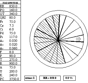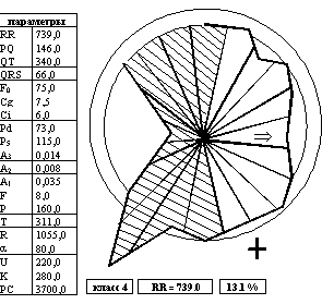 На рисунке представлены примеры таких Lобразов состояния¦ в соответствии с вышеупомянутой классификацией. В течение часа можно определить специфическую реакцию больного на введенное лекарственное средство или на лечебную процедуру и выбрать строго индивидуальную тактику лечения. Особенно важна для врача простота считывания конечной информации, при которой трудно допустить ошибку в трактовке данных и которая гарантирует контроль со стороны врача Lработы¦ решающих правил. Это обеспечивает двойной эффект - точность и быстроту. Аппаратно-программный комплекс, реализующий полипараметрические методы, включает набор неинвазивных датчиков и электродов, блок усилителей с аналого-цифровым преобразователем и гальванической развязкой, персональный компьютер типа IBM с принтером.