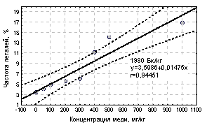 недостоверны. При увеличении в почве концентрации меди частота