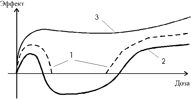 Общие закономерности влияния сверхмалых доз биологически активных веществ (БАВ) наиболее ярко проявляются при изучении дозовых зависимостей [4]. В некоторых случаях эта зависимость бимодальная: эффект возрастает при сверхмалых дозах препаратов, затем, по мере увеличения дозы, уменьшается, сменяется так называемой "мертвой зоной", где он не заметен, и вновь усиливается (рис. 1, кривая 1). Иногда в дозовой зависимости обнаруживается стадия эффекта "перемены знака". Например, если в области сверхмалых доз отмечалась ингибирующая активность, то по мере роста концентрации она сменялась стимулирующей, а затем вновь ингибирующей (рис. 1, кривая 2) [4]. В ряде случаев эффект в очень большом диапазоне концентрации почти не зависит от дозы (рис. 1, кривая 3.).