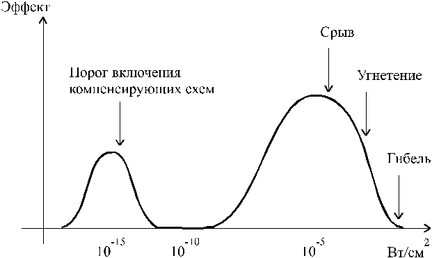 Похожие зависимости наблюдаются и при воздействии сверхвысокочастотных излучений (СВЧ-излучений). Так, на кривой зависимости величины физиологического эффекта от плотности мощности облучения, наблюдаются два максимума (рис. 2). Эти максимумы также разделены "мертвой зоной", наличие которой объясняется как результат включения в работу активных барьерных механизмов и компенсирующих систем организма. Когда эти силы перестают справляться, наблюдается тотальное возбуждение, завершающееся срывом и гибелью организма.