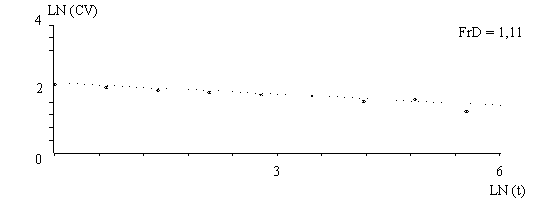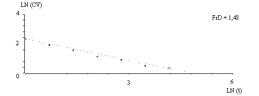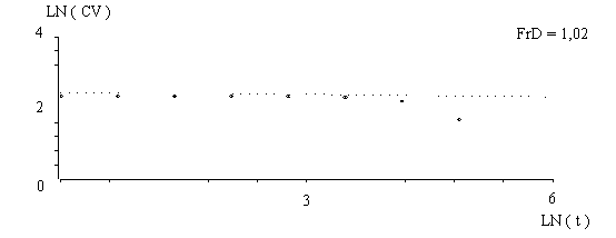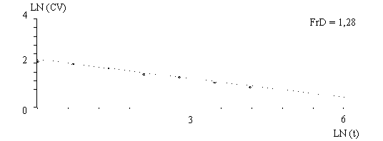 Используется временной ряд из N=2M отсчетов. На первом шаге из N=2M отсчетов вычисляется коэффициент вариации CV(1),% с использованием всех N значений временного ряда. Затем каждые 2 соседних отсчета усредняются и для вновь полученного временного ряда длиной N/2 вычисляется CV(2). На следующем шаге усредняются 2 отсчета из полученного на предыдущем шаге ряда длиной N/2 и вычисляется CV(3) и т. д. Данный процесс усреднения двух соседних отсчетов в пределах зерна укрупнения временной шкалы и расчета CV(i) для вновь модифицированного ряда производится M-1 раз до достижения ряда, состоящего только из 2 отсчетов, каждый из которых - результат усреднения первой или второй половины временного ряда. Затем строится в логарифмических шкалах график зависимости CV(i) от размера зерна укрупнения временной шкалы. Вычисляется тангенс угла наклона А(tgA) прямой регрессии для отмеченных точек оси X. Фрактальная размерность временного ряда FrD=1-tgA.