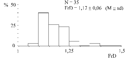 На рис. 3 представлена гистограмма распределения FrD сердечного ритма в группе обследованных (N=35). Распределение имеет несимметричный характер в интервале FrD от 1,08 до 1,35. Мода распределения находится в интервале 1,10-1,15, средняя величина - 1,170,06 (Msd).