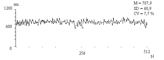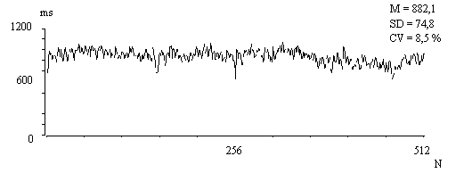 Сравнительный анализ данных, изображенных на рис. 1 серии I показывает, что традиционно используемый для оценки характеристик вариации сердечного ритма коэффициент вариации не позволяет с достаточной достоверностью разделить сигналы с различной динамической структурой.