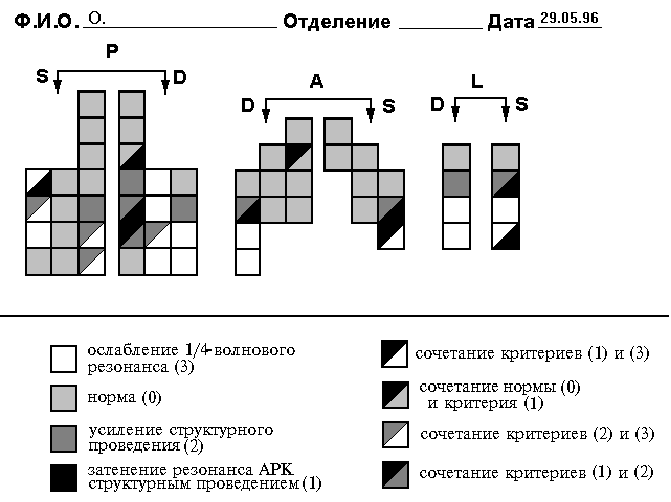 В качестве иллюстрации приводим случай пациента О., 42 года, который находился на лечении в стационаре с 28.05. по 26.06.96 г. с диагнозом: очаговая пневмония справа в нижней доле (8 сегмент) и в средней доле (4 и 5 сегменты), осложненная правосторонним экссудативным плевритом и острой сосудистой недостаточностью на фоне хронического катарального обструктивного бронхита в фазе ремиссии с дыхательной недостаточностью 1 степени.