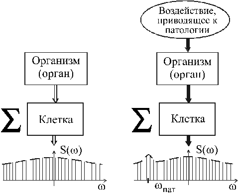 Традиционными методами медицинского контроля физиологического состояния организма человека являются биохимический анализ крови, электроэнцефалография, рентгенография, рентгеноскопия, электрофотография, ультразвуковая диагностика, компьютерная и ЯМР томография и пр. В то же время интенсивно разрабатываются новые, более совершенные методы контроля и исследования. Зачастую побудительной причиной поисков новых методов является стремление к более эффективной оценке наиболее тонких процессов гомеостаза. Например, установленным фактом является корреляция между нарушениями функций организма и патологией отдельных, составляющих его клеток, в частности, клеток крови, коль скоро речь идет об общем заболевании. Поэтому любое заболевание организма изменяет протекание метаболических процессов в клетках, инициируя тем самым процессы функциональной перестройки клеток и вариации спектров излучений собственных ЭМП клеток [14, 15]. Сказанное проиллюстрировано на рис. 2.