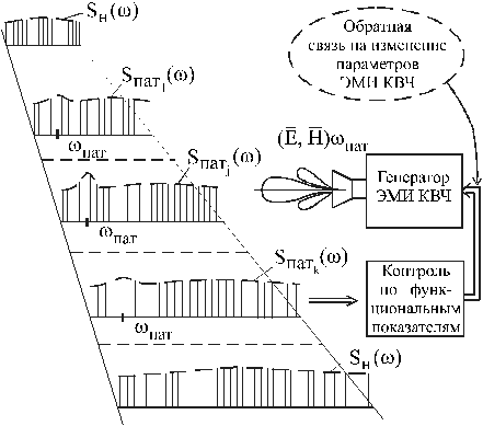 Например, в псевдошумовом спектре, характеризующем суммарное ЭМП собственных излучений клеток, наличие патологии проявляется изменением участка спектра в окрестности некоторой частоты пат (рис. 2, б).