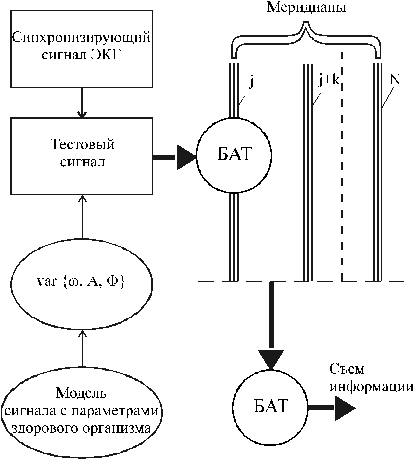 Как видно из структурной схемы на рис. 4, тестовый сигнал подводится к БАТ некоторого определенного (j-го) меридиана, а информацию о реакции соответствующего органа или системы снимается с других БАТ данного (j-го) или связанных с ним (j+k,..., N) меридианов. Кроме того, в тестовом сигнале в ручном и/или автоматическом режиме варьируется частота , амплитуда А и форма Ф сигнала. Предусмотрена возможность синтеза тестовых сигналов (через подбор параметров , А и Ф), адекватных модели сигнала с параметрами здорового организма. В этом смысле наблюдается зримая аналогия с концепцией волнового генома (А.Г. Гурвич, А.А. Любищев, Дзян-Каньджень, школа акад.В.П. Казначеева, П.П. Гаряев [21]).
