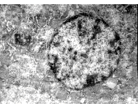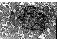 Нарушение утилизации гликогена в еще большей степени способствует угнетению процессов энергообеспечения и приводит к замыканию порочного круга в цепи патогенеза повреждения гепатоцитов. Тяжесть метаболических нарушений в гепатоцитах подтверждается наличием изменений со стороны ядер. Во всех случаях выявлены расширение перинуклеарного пространства и маргинация хроматина. Встречались ядра неправильной формы, с ундуляцией ядерной мембраны (рис. 3).