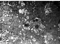 Функционально-морфологические признаки нарушения белковообразующей функции гепатоцитов закономерно сочетались с ультраструктурными и биохимическими изменениями, свидетельствующими об угнетении энергетического обмена в гепатоцитах. На фоне выраженного полиморфизма митохондрий, расширения и деструкции гладкой ЭПС в матриксе имелись обширные поля гликогена (рис. 2). Вместе с тем, содержание глюкозы в цельной капиллярной крови у этих больных было снижено и составило (3,2 ммоль/л), что подтверждает наличие ферментативной и энергетической блокады углеводного обмена на уровне гепатоцита. Отмечено, что блокада углеводного обмена, сопровождающаяся накоплением в гепатоцитах большого количества гликогена, наблюдалась преимущественно у больных с морфологическим диагнозом ХАГ.