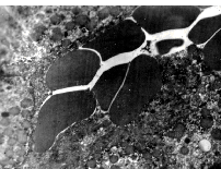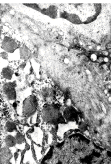 Тяжелые морфо-функциональные изменения спровоцированы воспалительными и фибропластическими изменениями в печеночной ткани, которые непосредственно связаны с хроническим поражением HBV и подтверждается наличием HBsAg. Наблюдается пролиферация и активация купферовских клеток, обнаружены множественные контакты активных лимфоцитов с мембраной и проникновение их в цитоплазму гепатоцитов. Синусоиды резко расширены с гипертрофией микроворсинок. Характерна массивная коллагенизация синусоидов и наличие коллагеновых волокон в цитоплазме гепатоцитов (рис. 5).