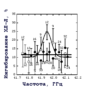 Рис. 2. Зависимость степени ингибирования люминол-зависимой хемилюминесценции нейтрофилов, активированных опсонизированным зимозаном, от частоты КВЧ излучения. Время воздействия излучения на интактные нейтрофилы - 40 мин. - величина эффекта в ближней зоне желобкового излучателя (на расстоянии 65 мм от его торца, ПППЭ - 240 мкВт/см2); - величина эффекта в дальней зоне (на расстоянии 400 мм от торца излучателя, ПППЭ - 150 мкВт/см2). Прямой линией показана средняя величина эффекта в дальней зоне. Каждая точка на графике представляет среднее значение указанного числа независимых экспериментов; доверительный интервал (p > 0,95), рассчитан по критерию Стьюдента (то же - для рис. 4)
