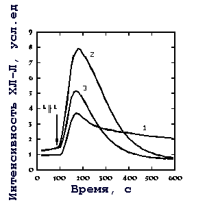 Рис. 3. Оригинальные записи уровня люминол-зависимой хемилюминесценции нейтрофилов, активированных ФМА (1 мкМ). 1 - интенсивность ХЛ-Л интактных клеток, 2 и 3 - ХЛ-Л клеток, предварительно обработанных А23187 (7,5 мкМ). 1, 2 - необлученные клетки; 3 - облученные клетки (непрерывная генерация, fн = 41,95 ГГц, ПППЭ - 100 мкВт/см2, время облучения - 20 мин.)