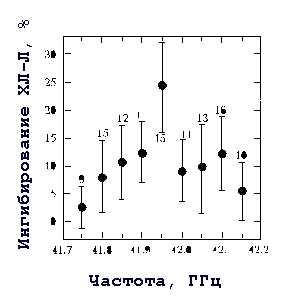 Исследование действия непрерывного ЭМИ КВЧ в узком частотном диапазоне (41,75-42,15 ГГц) на реакцию синергизма кальциевого ионофора А23187 и ФМА в нейтрофилах показало высокую селективность систем связанных биохимических реакций, участвующих в активации респираторного взрыва, к несущей частоте излучения (рис. 4). При несущей частоте излучения 41,95 ГГц обнаружено максимальное ингибирование синергической реакции - около 25%, достоверно отличающееся от эффекта ЭМИ КВЧ для других несущих частот. ПППЭ в этой серии экспериментов была около 50 мкВт/см2. Величина эффекта слабо зависела от ПППЭ и при ПППЭ от 20 до 150 мкВт/см2 в среднем составляла около 24%.