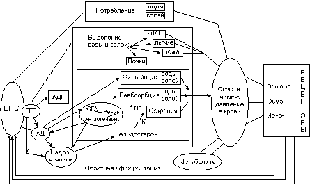 Данная функциональная система имеет два звена саморегуляции: внешнее (целенаправленное поведение для потребления воды и солей) и внутренее звено саморегуляции, включающее в себя ряд механизмов, одним из которых является система выделения воды и солей, где важнейшим исполнительным органом работает почка [10].