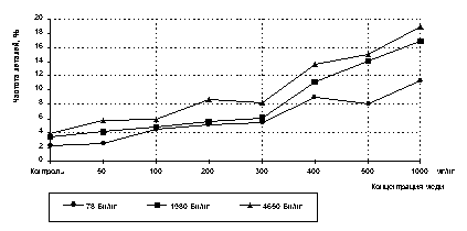 Частота летальных мутаций у растений, выращенных на почве с низкой радиоактивностью и без дополнительных доз меди, была равной 2,2%. Дальнейшее увеличение содержания меди в почве вело к постепенному росту частоты мутаций, достигающих в варианте Н-400 величины 8,8%. Эта частота мутирования статистически достоверно (P < 0,05) отличается от контрольной частоты мутаций. В следующем варианте этого блока (Н-500) суммарная частота мутаций оказалась на 0,8% ниже, чем в предшествующем и статистически достоверно от контроля не отличалась. Однако при концентрации меди в почве 1000 мг/кг суммарная частота вновь возросла, достигнув 11,3% и различия стали достоверными уже при P < 0,01.