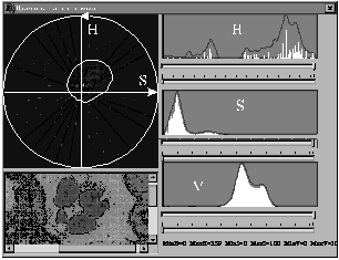 Предварительные исследования изображений, поступающих на вход системы, показали, что изображение может быть сегментировано по цветовым признакам. Эксперименты проводились с помощью специально разработанного программного модуля, позволяющего выделять в цветовом пространстве HSV области, ограниченные плоскостями, перпендикулярными осям цветовых координат. Пикселы изображения, цвет которых не входит в выделенную область, окрашиваются в черный цвет. Изменяя границы области удалось выделить множества цветов, соответствующих фону, ядрам лейкоцитов, цитоплазме лейкоцитов и эритроцитов. На рис. 2 приведены гистограммы всего изображения, а на рис. 3 - гистограммы ядра лейкоцита.