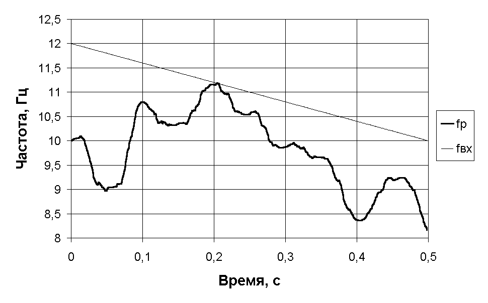 Рис. 4. Графики изменения частоты полезного входного сигнала (fвх) и резонансной частоты СУФС (fp) в процессе настройки на сигнал с шумами и помехами