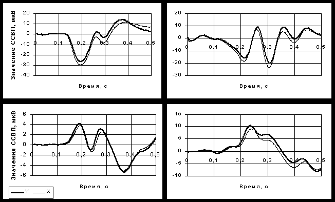 Сопоставляя рис. 6 и данные таблицы, можно сказать, что часть различий определяется влиянием на выходной сигнал переходного процесса в СУФС, поскольку входной сигнал имеет переменную частоту и амплитуду. Другая часть отличий являет ся концептуальной, т.к. СУФС не пропускает постоянную составляющую сигнала. Оставив для дальнейших исследований вопрос о количественном соотношении этих составляющих и способах их уменьшения, можно утверждать, что предлагаемые алгоритмы обработки ВП, не ухудшая диагностической ценности регистрируемых параметров, позволяют улучшить ОСШ, уменьшить уровень субъективизма, создают предпосылки автоматизации диагностического процесса и повышения точности топографической привязки источников биоэлектрической акт ивности.