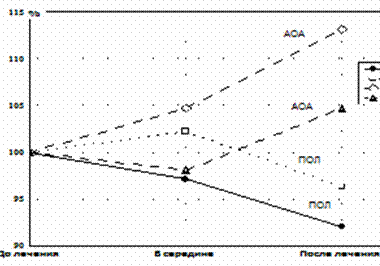 Рис. Динамика показателей ПОЛ и АОА плазмы крови; обозначения:
